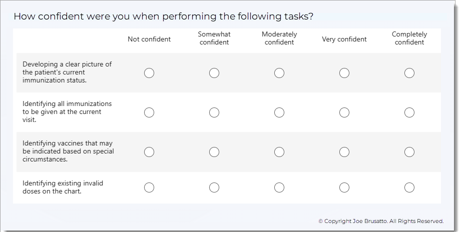 The third measure is the difference in reported confidence levels when performing specific immunization management tasks, measured using 10-point scales. For this measure, the tasks to be assessed are: