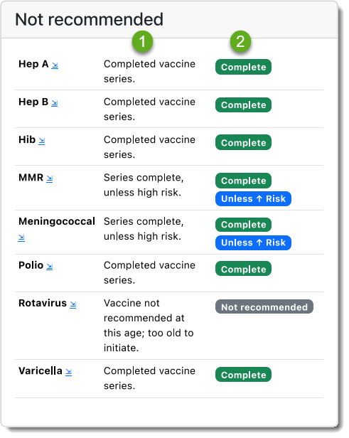 Some series will display more than one badge, for example Complete and Unless ↑ Risk if a series is completed but an additional dose may be indicated for some patients.